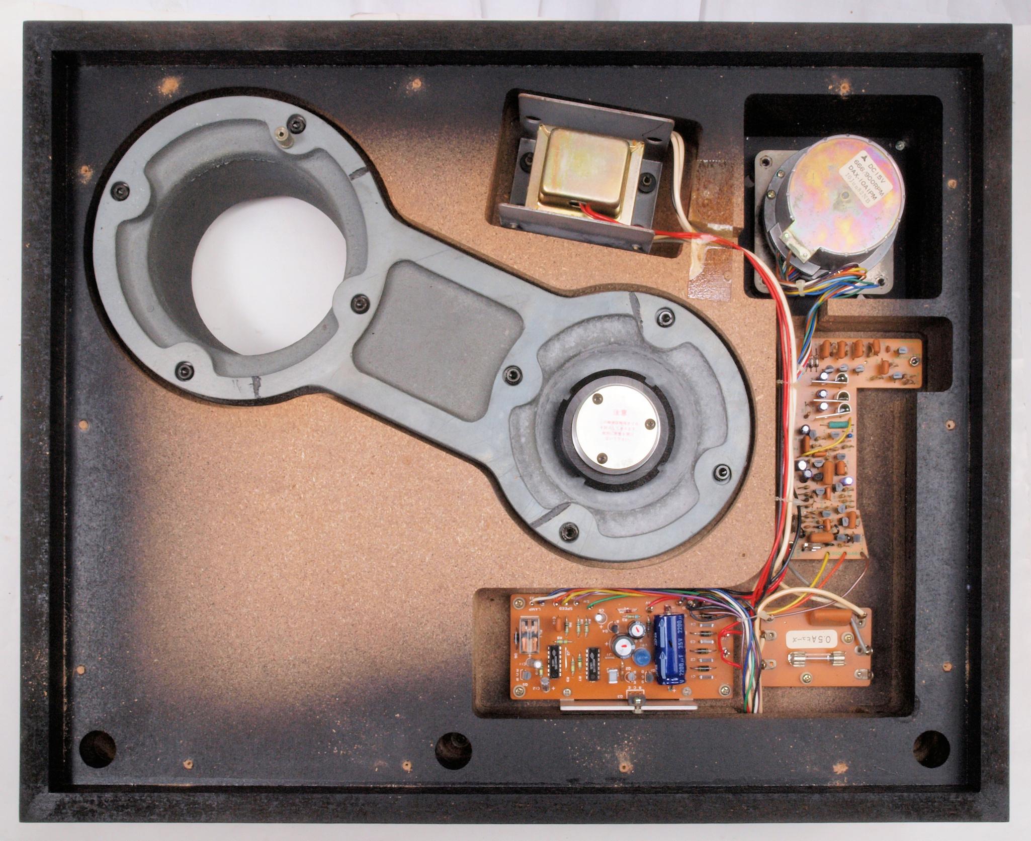 | W. 下蓋及び本体木部 修理状況。 画像をクリックすると、大きく(横幅2050ドット)表示されます。 W1. 修理前 モーター、基板、アーム架台を取り本体上から。 |