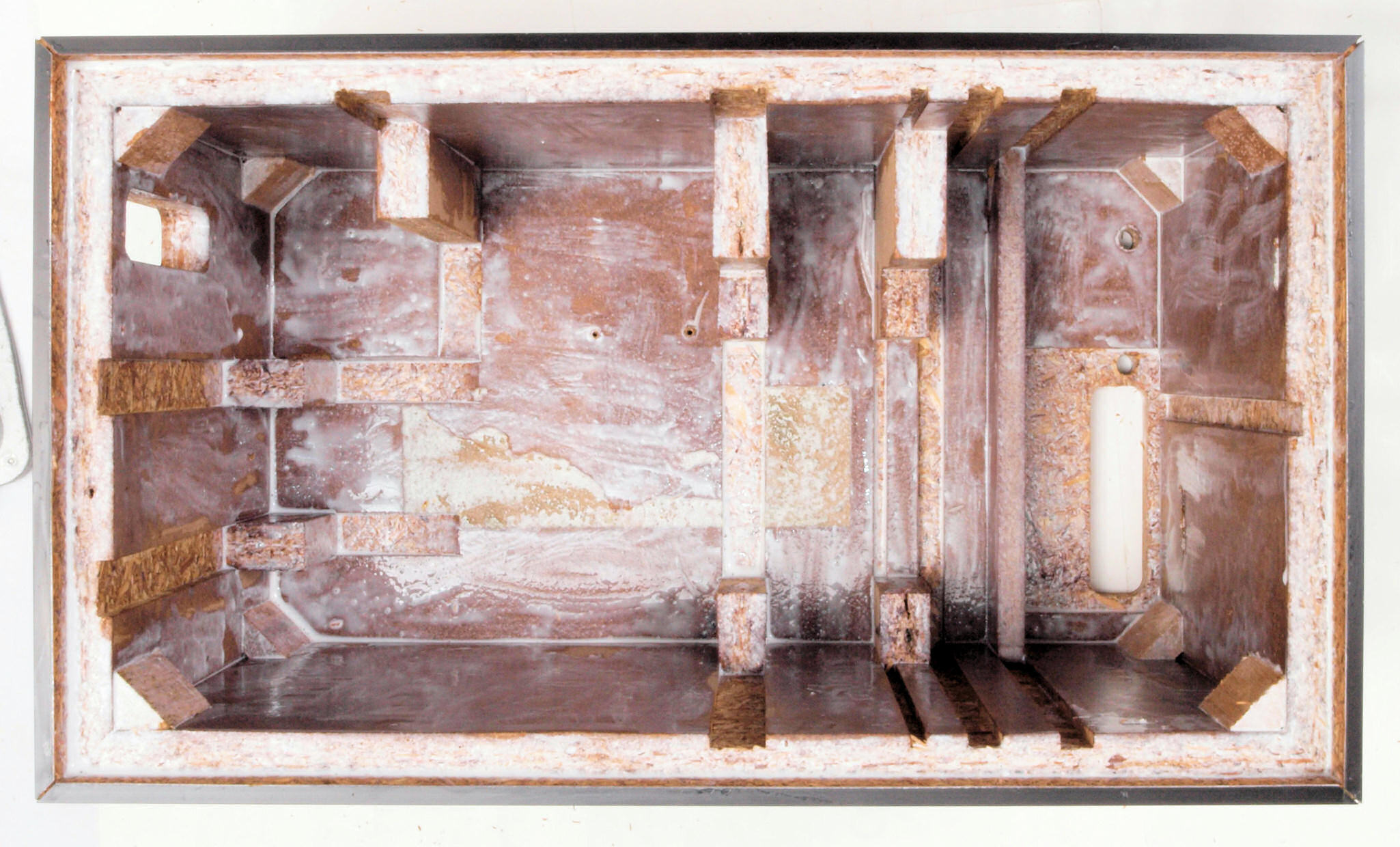 C48. 修理中 接着材が劣化した木箱、下後左から見る。圧縮板にボンドを塗って固めている。