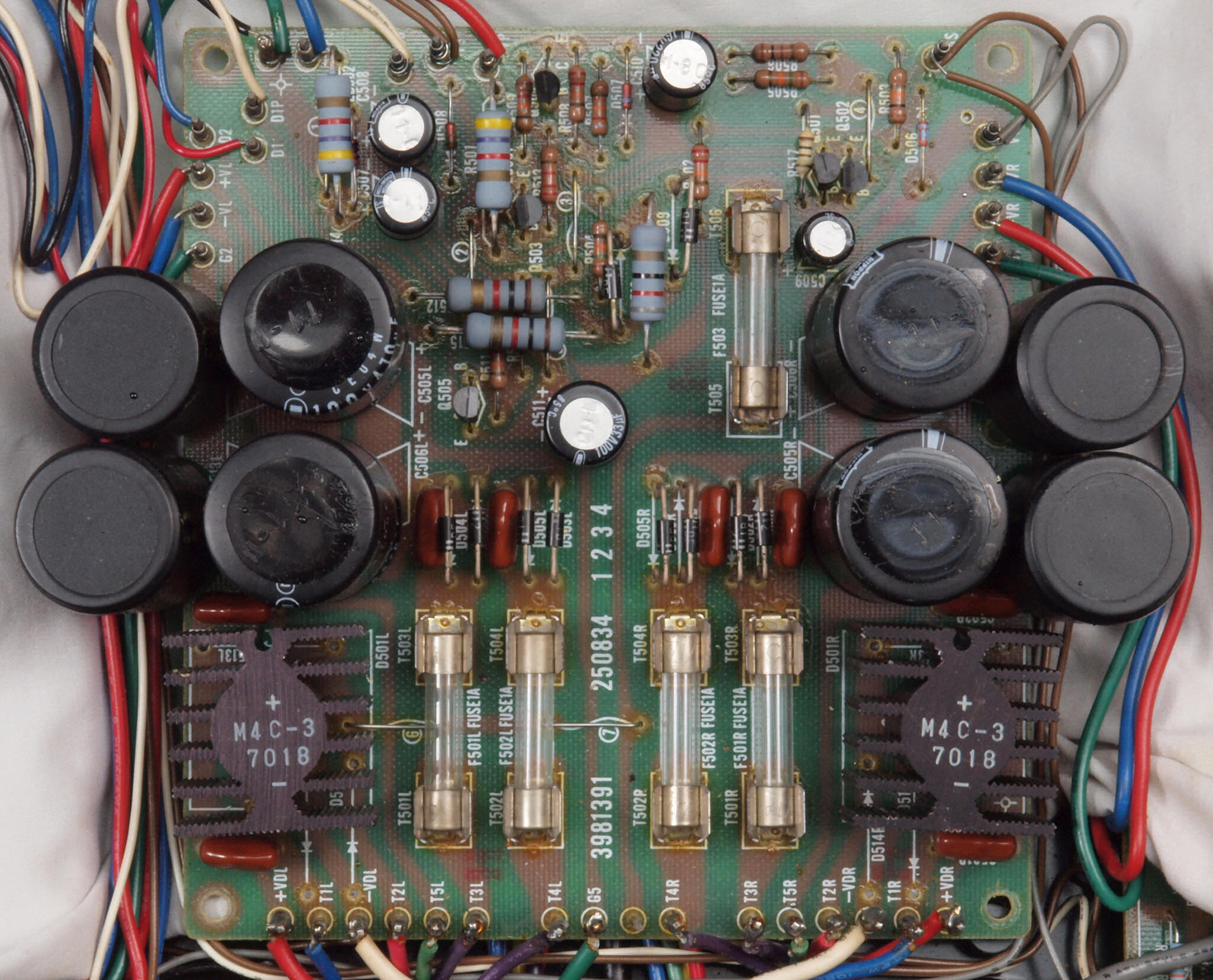 | C12. 修理後 R側ドライブ基板。 初段FET(電界効果トランジスター)、バランス・バイアス調整用半固定VR3個、SP接続リレー交換 ヒューズ入り抵抗全部、電解コンデンサー11個、TR(トランジスター)2個交換、モジュール修理交換部品は除く。 |