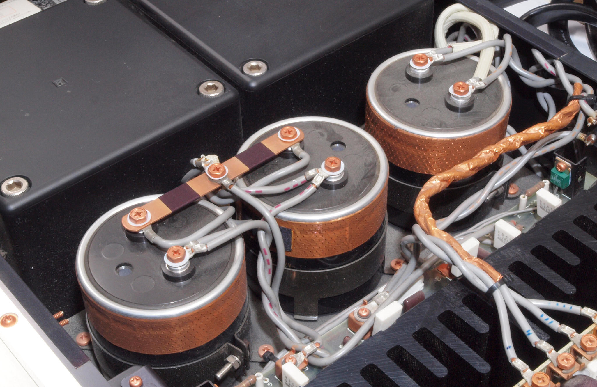 A32. 点検中 木ケースから取り出し、上から見る。 終段電源ブロック電解コンデンサーに巻いた銅箔テープ。
