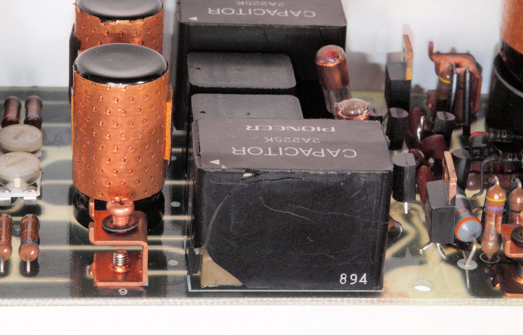 A45. 点検中 木ケースから取り出し、上から見る。 定電圧電源基板のフイルムコンデンサーのヒビ割れ その2。