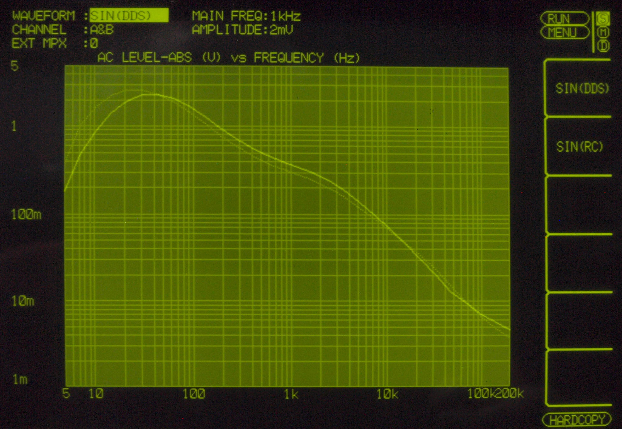 AUX入力端子へ150mV一定入力、VRはmax、左出力=薄(細い)色 右出力=濃い(太い)色。